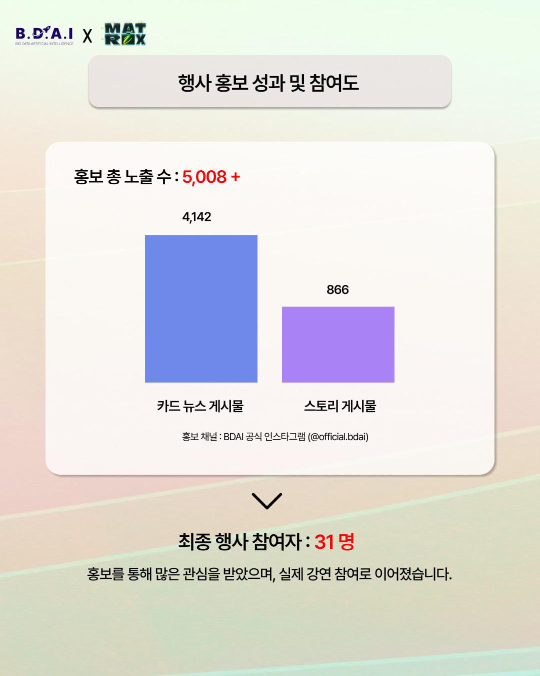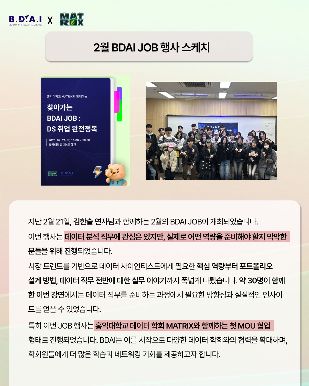 BDAI는 앞으로도 다양한 기관 및 학회와의 협력을 기반으로 데이터 직무를 준비하는 분들에게 보다 실질적인 기회를 제공해 나갈 예정입니다.