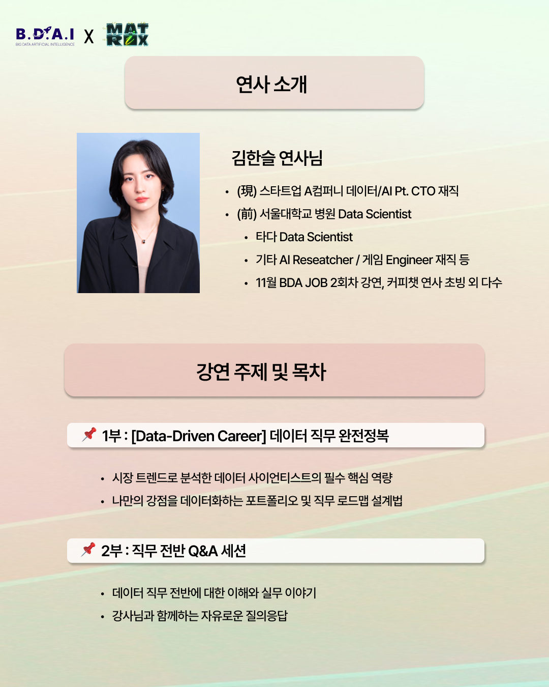 BDAI는 데이터 분야 진로 탐색과 실무 역량 강화를 위해 현직자 강연 프로그램 ‘BDAI JOB’을 운영하고 있습니다.