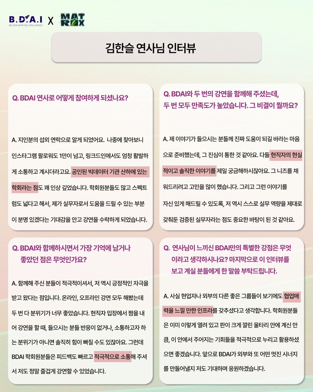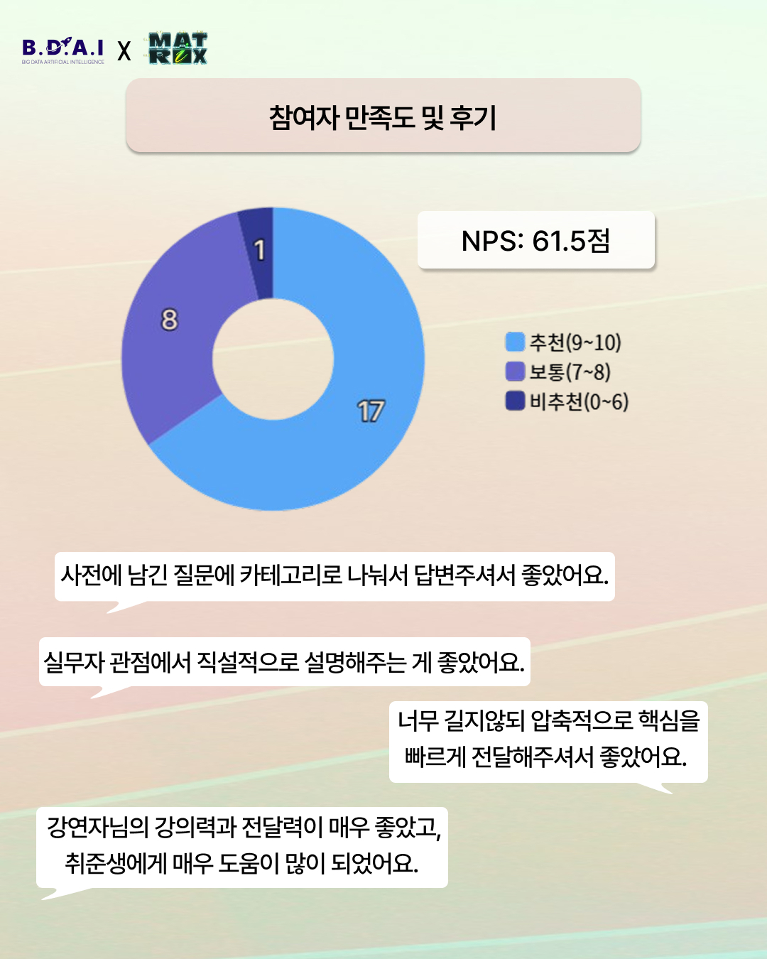 매 기수 보내주시는 소중한 피드백을 밑거름 삼아, 어제보다 더 성장하는 BDAI가 되겠습니다.
