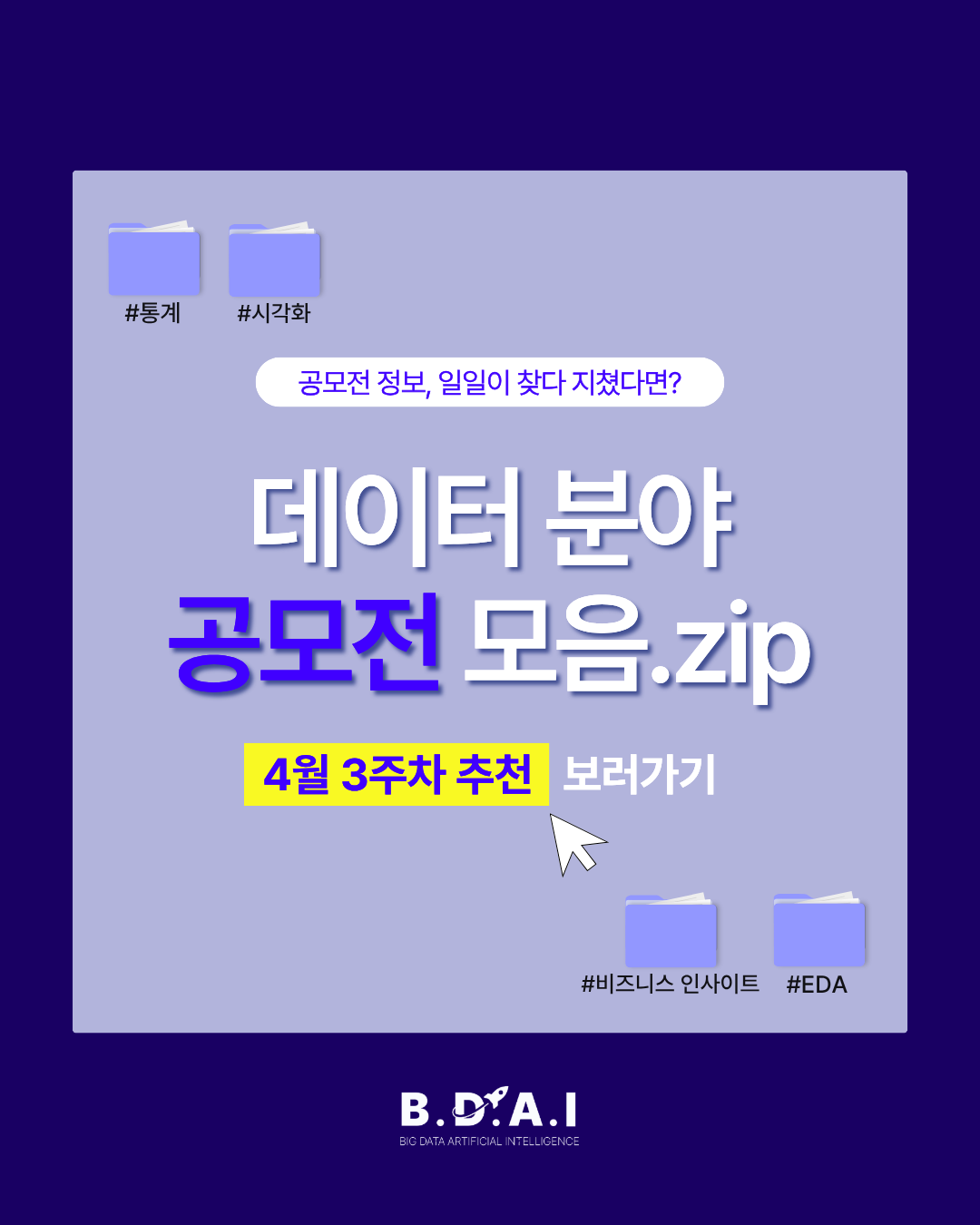 안녕하세요, AI 빅데이터분석학회 BDAI입니다.💞 BDAI에서 배운 내용을 어떻게 활용하고 스펙으로 남길지 고민되시나요? 그런 학회원 분들을 위해, 데이터팀에서 데이터 공모전 모음.zip을 제작했습니다!💭…
