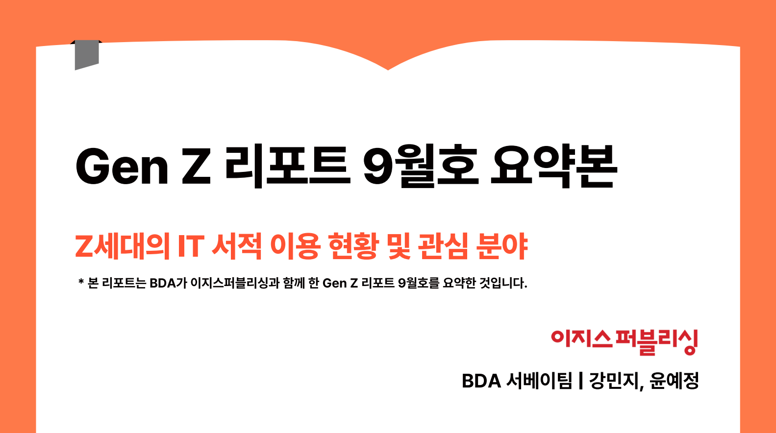 안녕하세요, BDAI 서베이&리포트팀입니다. 이지스퍼블리싱과 함께 협업하여 발간된 'Z세대의 IT 서적 이용 현황 및 관심 주제' Gen Z 리포트 샘플 공유 드립니다. 유의미한 인사이트 제공을 위해 지…