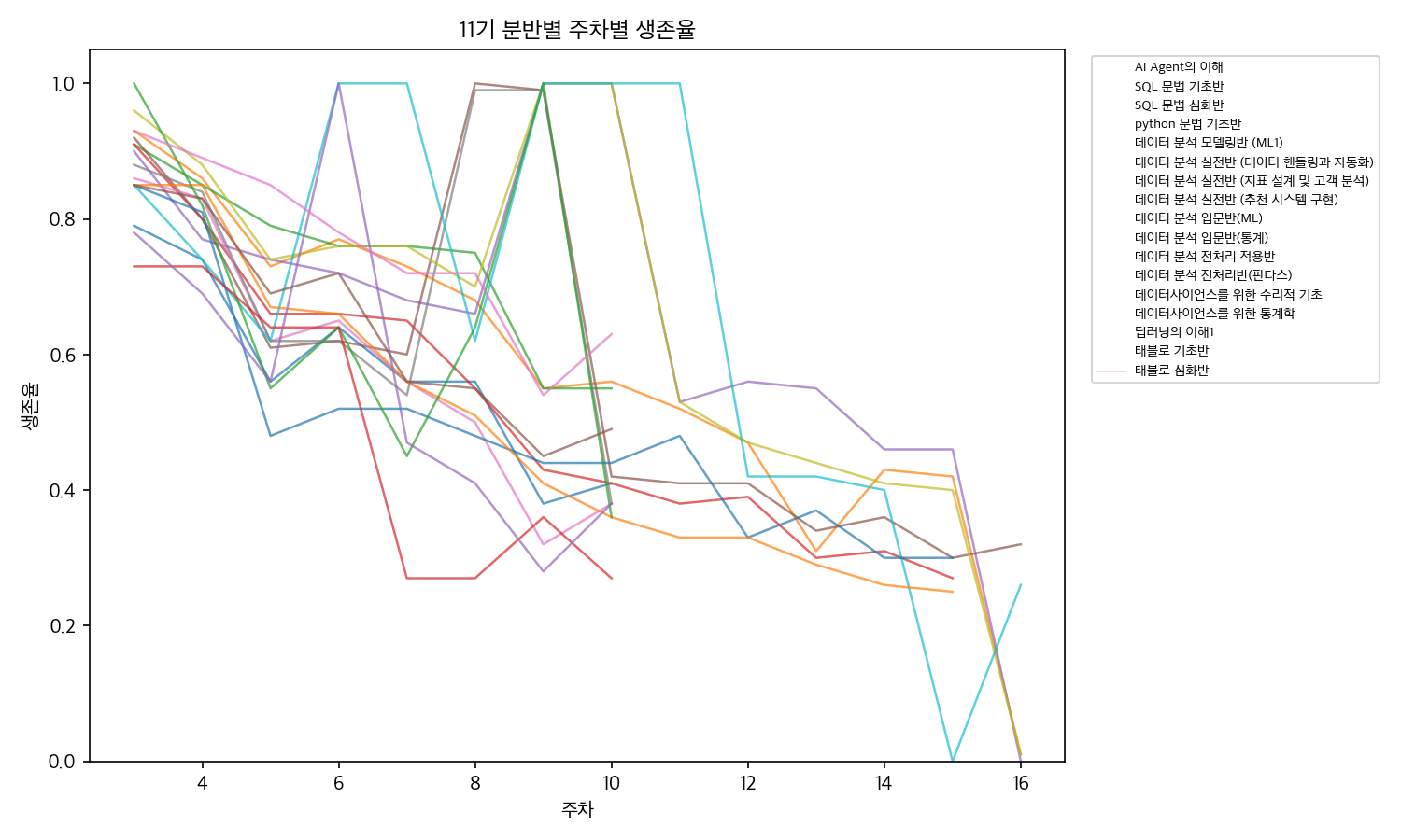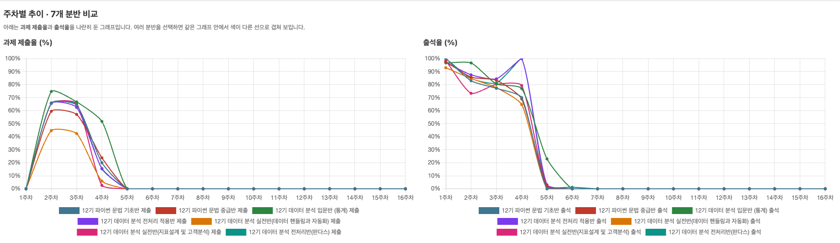 비교의 한계: 분반마다 정원, 커리큘럼, 진행 주차가 상이하며 데이터 추출 시점이 달라 단순 비교가 어렵습니다.