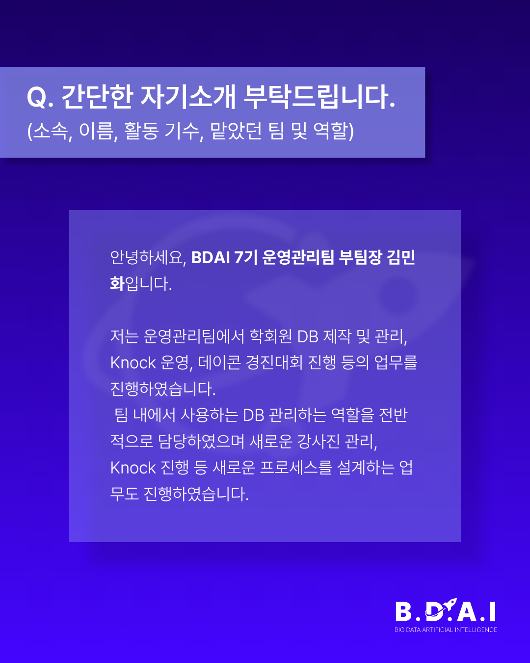 BDAI 7기 우수 운영진, 운영관리팀 김민화 부팀장 인터뷰를 공유합니다.