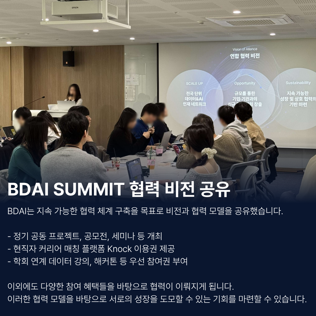 BDAI는 앞으로도 다양한 기관 및 학회와의 협력을 기반으로 데이터 직무를 준비하는 분들에게 보다 실질적인 기회를 제공해 나갈 예정입니다.