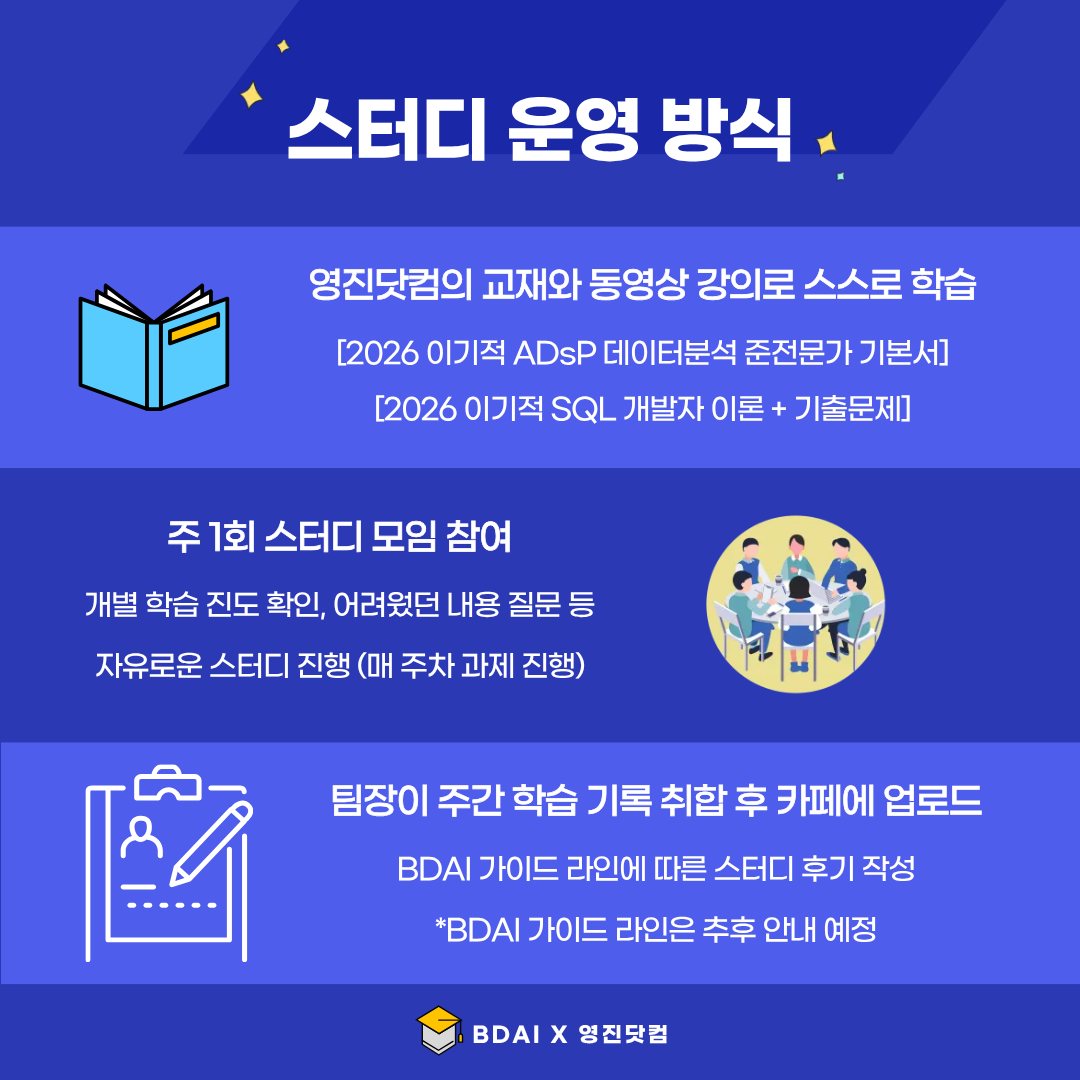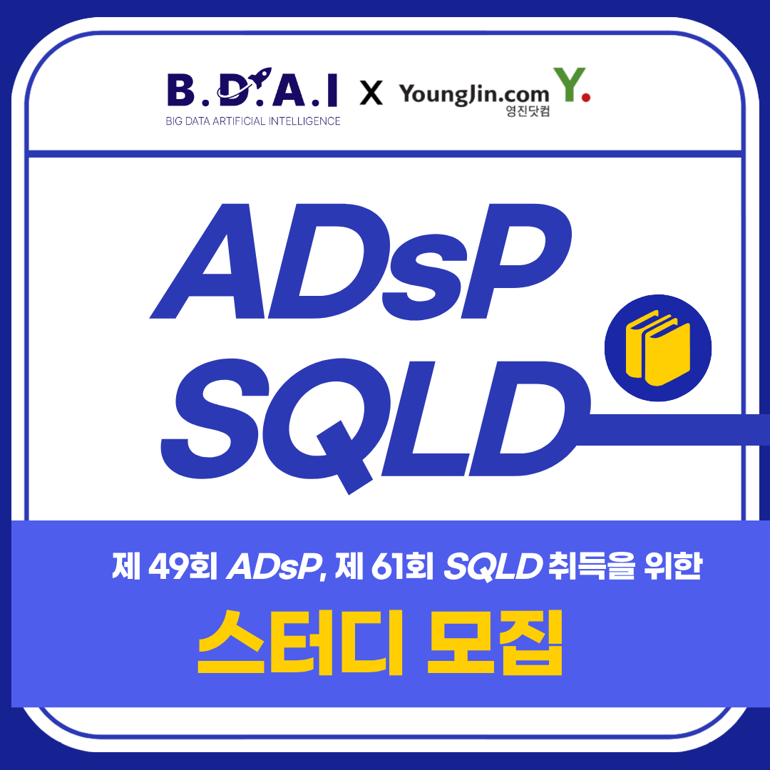 영진닷컴과 함께 ADsP(데이터분석 준전문가), SQLD(SQL 개발자) 자격증 대비 스터디를 모집합니다!📘💖